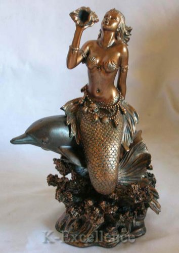 MERMAID WITH DOLPHIN & CONCH STATUE Fantasy Sculpture Figurine Antique Bronze Finish Review